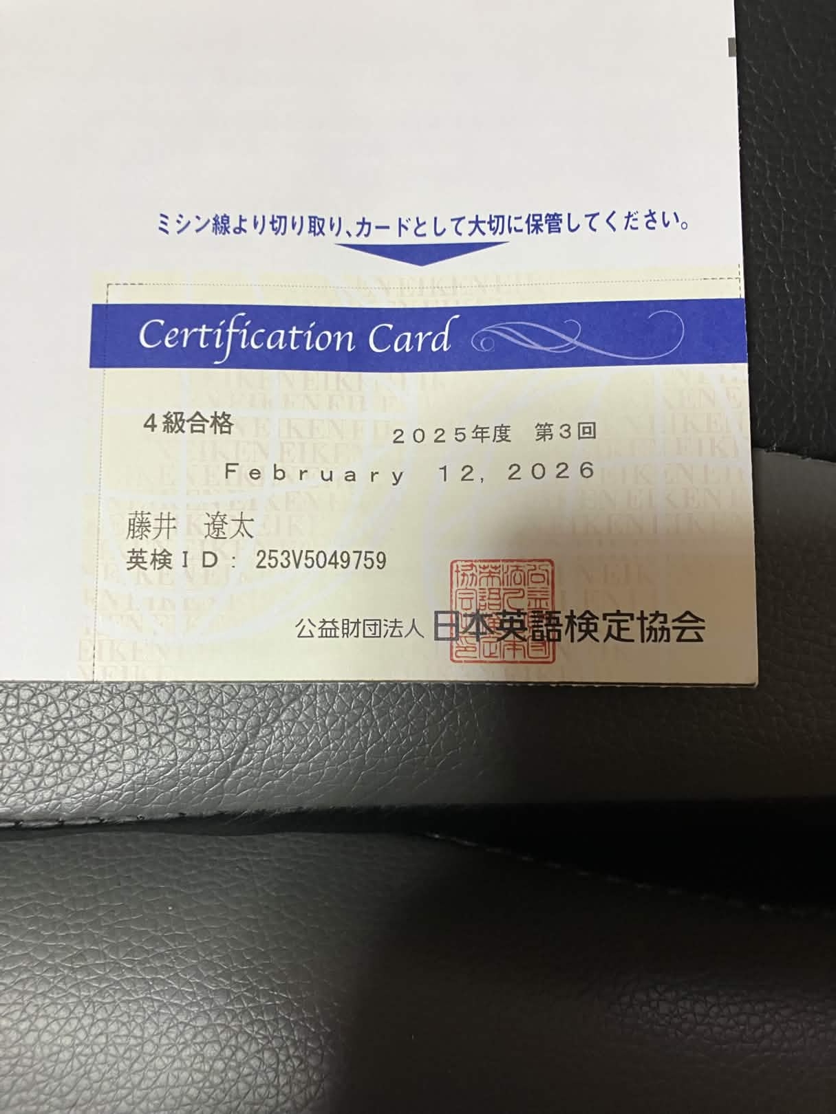 英検4級 日記 X Facebook はてブ LINE コピー 2026.02.25 遼太君がやってくれました! なんと英検4級合格の報告をしてくれました! お父ちゃんは嬉しいです! お母ちゃんは「アタシも受けようかなー」と早速影響されています。